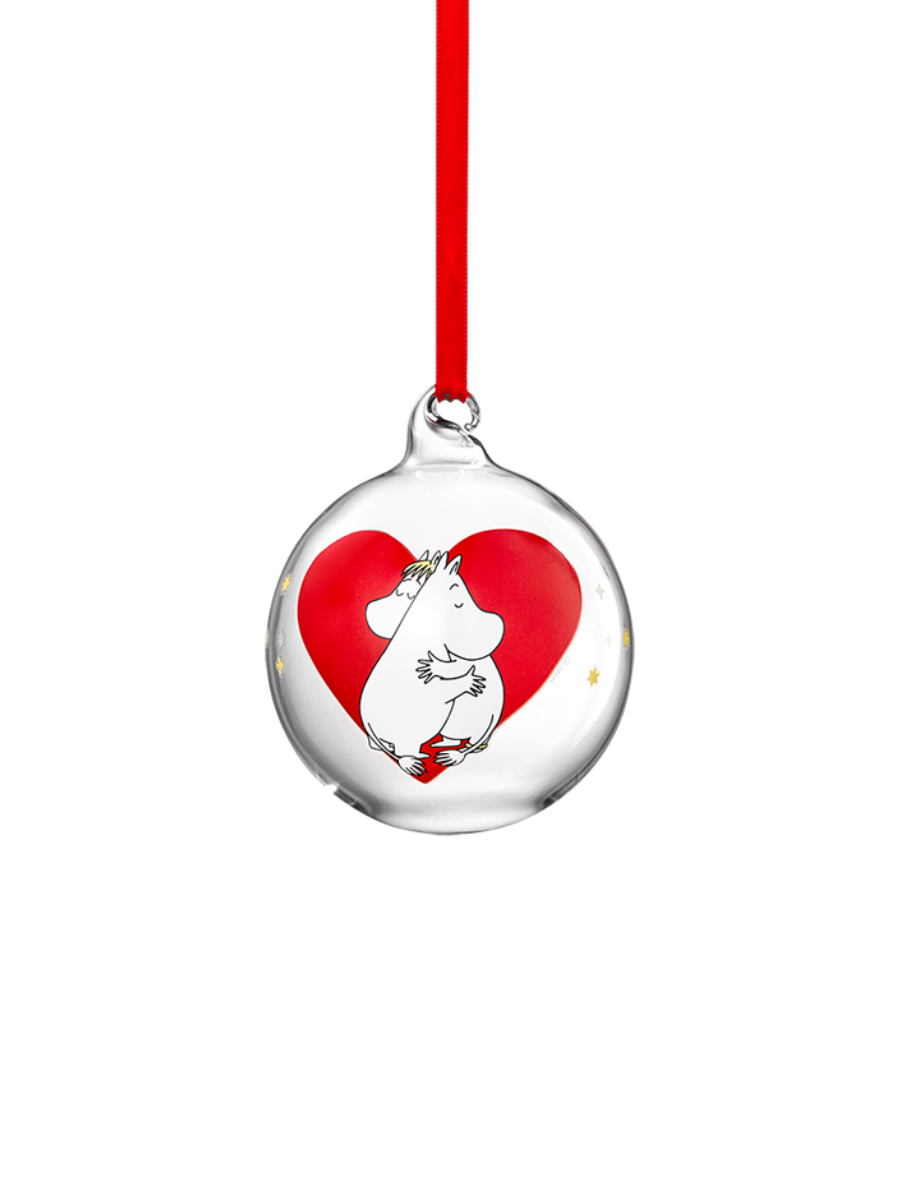Moomintroll and Snorkmaiden are hugging in front of a big heart. Decorate the Christmas tree, or bring a dash of festive spirit home with Moomin Christmas decorations. Adorned with a pretty red ribbon, ready to hang on your tree or anywhere you fancy. A gorgeous Christmas decoration or little gift for a loved one, use it year after year. Sure to warm anyone's heart.