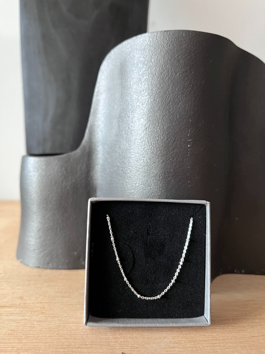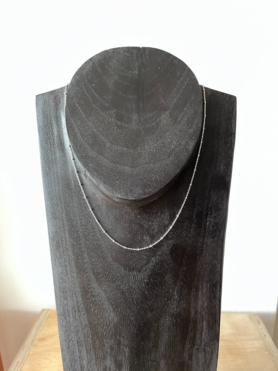 This delicate Silver Satellite Chain Necklace is perfect worn on its own or layered with other pieces. This 18" necklace features small polished balls dotted along the length which catch the light. Minimalist and extremely wearable, this Satellite necklace will be your go-to piece for day or evening.