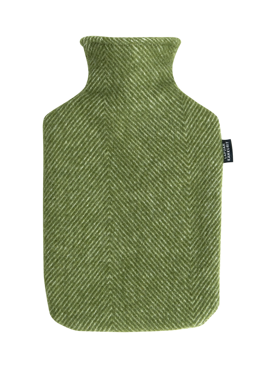 Keep yourself warm and toastie with this gorgeous luxury 100% pure new wool covered hot water bottle. A classic Scandinavian designed cover in felt wool with a two tone herringbone pattern in olive green and white. The quality, 2 litre hot water bottle is made by the well-known German company Fashy GmbH from odourless, non-fading and recyclable thermoplastic.